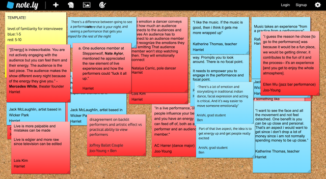 After conducting each interview, the interviewer transcribed their notes and discussed with the team what they believed was most insightful from their conversation. We also created a Note.ly board, which can be seen below, that is organized by familiarity level and highlights the most key points and quotes from our interviewees. In addition to this Note.ly board, Joo-Young, Ben and Harriet conducted two insights brainstorm sessions that helped define key insights going forward into the next quarter.