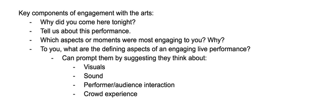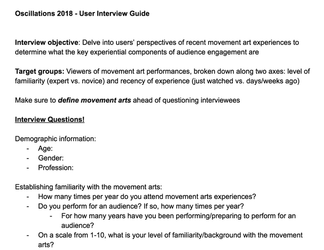 After some initial interviews, we developed an interview guide, which can be seen below. This guide addresses the familiarity of our interviewee with the movement arts, their perspective of what constitutes an engaging live performance and how that is different from a 2D experience. We also prompted them to discuss their experience seeing movement arts performances in the presence of others and whether they thought virtual reality could fill any holes in how they experienced dance. Through our interviews, we prompted interviewees to define their language, seeing as most mentioned there is an “energy” in the room when they are in a live performance. We sought to really understand those terms and get beneath the surface to evaluate this language.